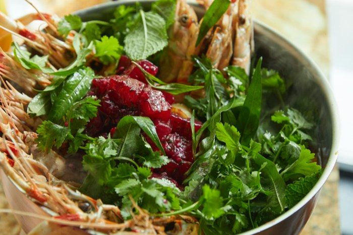 虾头和虾壳用黄油,加香茅、大蒜、小香葱煎香,做成虾油酱汁。Carpaccio里加入了言盐定制的咸度为2.9的鱼子酱,一点芥末籽,香草油,亚洲风味汁,青苹果啫喱,激发虾肉的甜味。精华的虾脑由客人席前挤出,还原到虾身Carpaccio上。