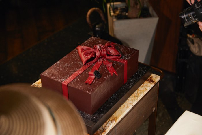 【言盐的礼物】为紫罗兰混合莓果香草蛋糕。外层用巧克力做成礼盒的样子,切开后里面是用紫罗兰面粉、香草、树莓、黑莓、蓝莓、紫罗兰的果蓉、新鲜的莓子、奶油和马斯卡彭芝士做成的蛋糕。