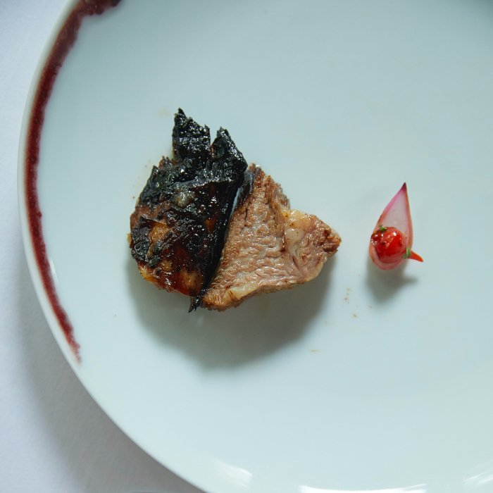【当季牛肝菌火腿汁煨鱼唇】牛肝菌使用当季云南的黄牛肝菌。厚切牛肝菌,用高油温煎制,外层煎成金黄色,锁住汁水。用大蒜、小干葱,炒制,去除略带的异味。再用十公斤口蘑浓缩成一公斤的口蘑汁水来烩制牛肝菌,再为牛肝菌增添菌香味。干货鳐鱼鱼唇经过一周泡发,用西式即食火腿骨、老母鸡、鲍汁做成类似中式高汤,再以煨制干货的方式来煨鱼唇,鱼唇调味源自火腿骨和高汤的底味,不再额外添加味道。