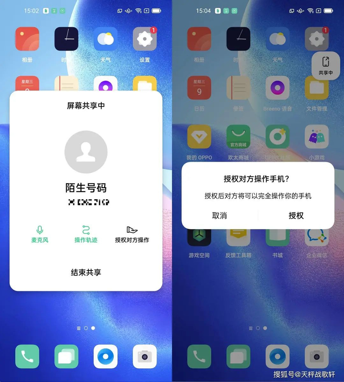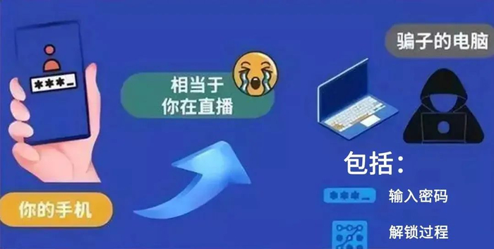 “屏幕共享”相当于对方跟你同步使用手机。它会把屏幕上显示的内容同步让对方看到,包括弹框显示短信、微信、其他App推送的内容。也就是说,你在手机上的任何操作,对方电脑上都能看到,包括输入密码、解锁的过程。