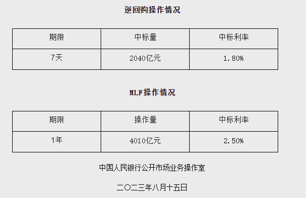 今年6月15日,央行公告称,为维护银行体系流动性合理充裕,央行开展2370亿元MLF操作和20亿元公开市场逆回购操作,充分满足了金融机构需求。当日,有20亿元逆回购和2000亿元MLF到期,因此当日实现净投放370亿元。当时,MLF较前一个月下调0.1个百分点,为2022年8月以来首次下调。相比之下,今天下调利率的幅度更大。