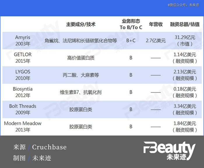 《FBeauty 未来迹》在一文中做过梳理,国外的合成生物企业起步早于国内,目前涉及化妆品领域的海外合成生物企业主要有Amyris、GETLOR、LYGOS等6家企业。