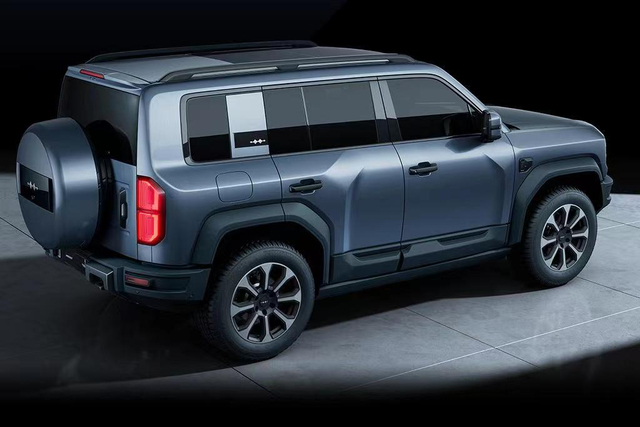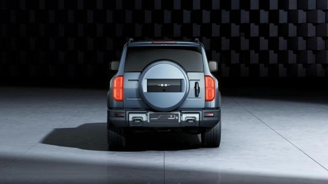 车尾部分,上窄下宽的造型和外挂式备胎没有缺席,尾灯组为竖状,并形成上下对称的样式,“回”字形结构尾灯和前脸相呼应,下保险杠处还配备了拖车孔和两个锚点。