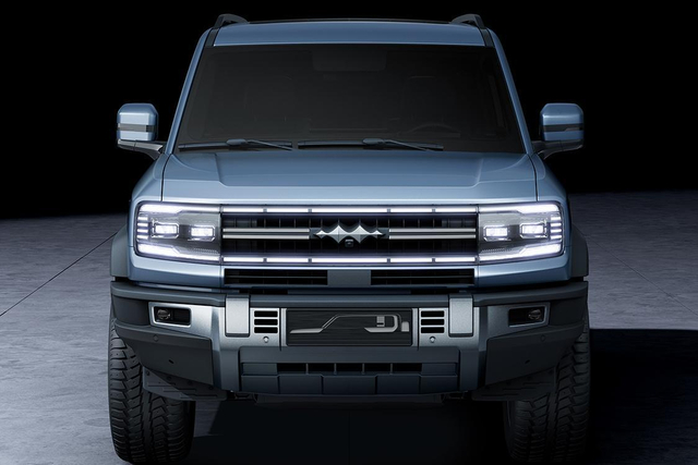 新车整体造型方正。前脸部分配备了比较醒目的上下两条贯穿式灯带,与头灯的外侧光源形成环形灯带,整个大灯造型呈现方形,较为复古,在中央位置放置了方程豹LOGO标识,下方为略为凸出的黑色保险杠以及银色防护板,提升了越野气息。