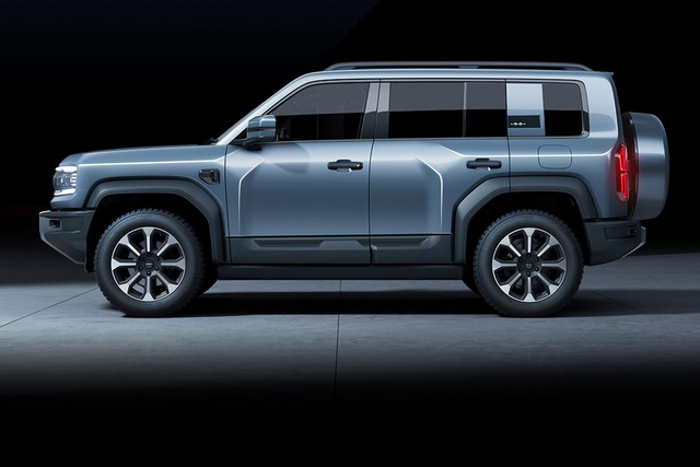 车身侧面同样采用了较为平直方正的设计,车顶配有行李架,外凸的黑色轮眉、门槛都体现了不错的硬派越野风格,细节上,前翼子板处配有侧后向摄像头,C柱做了加宽同色处理,并将品牌LOGO内置其中,提升了几分精致度。