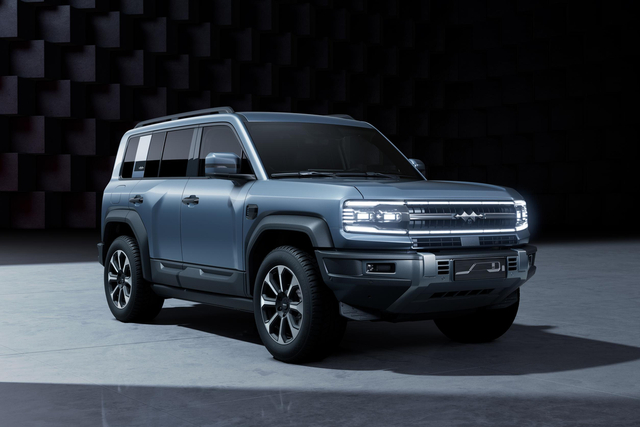 车身尺寸方面,新车车长接近4.9米,轴距2.8米左右 ,拥有较大的接近角、离去角和离地间隙,整体的车身尺寸和奔驰G级差不多,定位中型新能源硬派越野SUV。