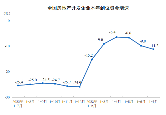 1—7月份,房地产开发企业到位资金78217亿元,同比下降11.2%。其中,国内贷款9732亿元,下降11.5%;利用外资30亿元,下降43.0%;自筹资金23916亿元,下降23.0%;定金及预收款27377亿元,下降3.8%;个人按揭贷款13950亿元,下降1.0%。