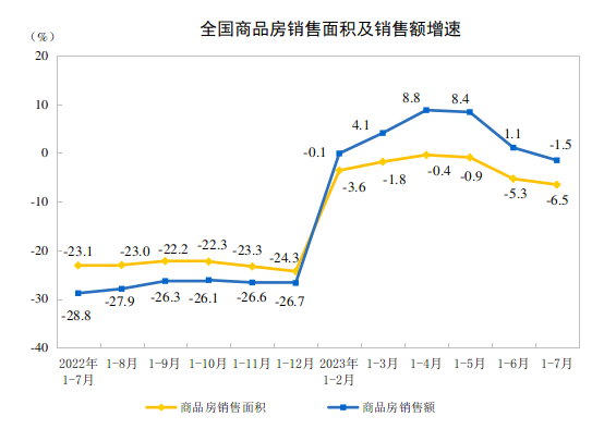 1—7月份,商品房销售面积66563万平方米,同比下降6.5%,其中住宅销售面积下降4.3%。商品房销售额70450亿元,下降1.5%,其中住宅销售额增长0.7%。