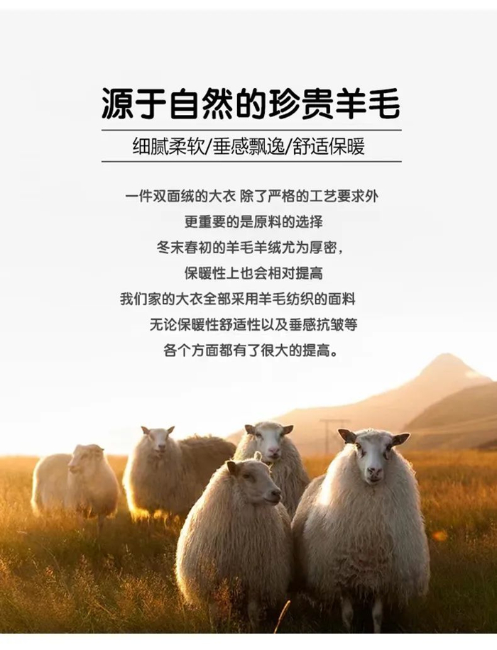 而羊毛拥有天然卷曲的形状,带有天然蓬松感,每一寸面料上都有阳光亲吻过的温度,自然十分保暖。