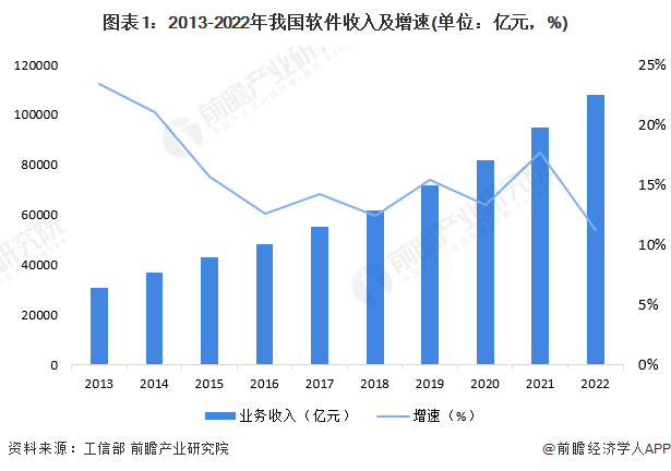 2022年,我国软件业完成软件业务收入108126亿元,同比增长11.2%,增速较2021年同期放缓6.5个百分点。