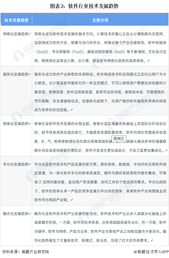 未来,软件行业技术将呈现网络化、服务化、智能化、平台化以及融合化的发展趋势,具体表现如下表所示: