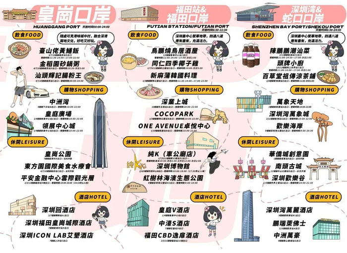 通过推荐口岸附近的吃喝玩乐游购娱,满足港友们下班来深或周末游短期出行需求,希望大家可以通过City Walk的形式“丝滑”入深。