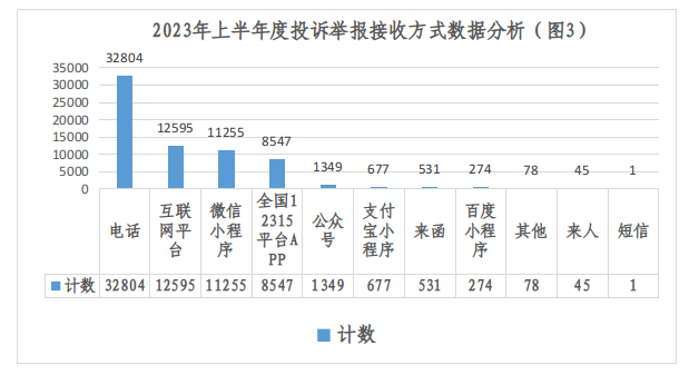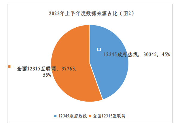 从数据来源来看,上半年度12345政府热线来源30345件,全国12315互联网平台来源37763件。从接收方式来看电话、互联网平台、微信小程序、APP、公众号排名前五。