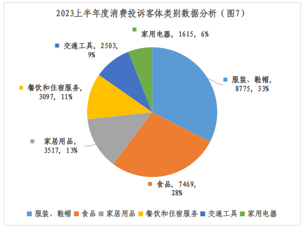 上半年度消费投诉客体类别前六名分别是:服装、鞋帽 8775 件;食品 7469 件;家居用品 3517件;餐饮和住宿服务 3097件;交通工具 2503 件;家用电器1615件。服装、鞋帽超越食品安全问题位居第一,其中主要是售后服务问题和产品质量问题引起的投诉。