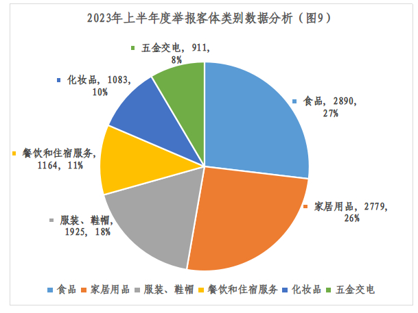上半年度举报客体类别前六名分别是:食品2890件、家居用品2779件;服装、鞋帽1925件;餐饮和住宿服务1164件;化妆品1083件;五金交电911件。