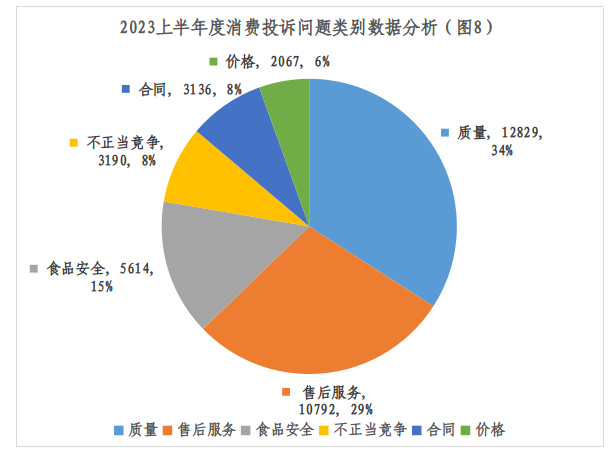 上半年度消费投诉问题类别前六名分别是:质量12829件;售后服务10792件;食品安全5614件;不正当竞争3190件;合同3136件;价格2067件。