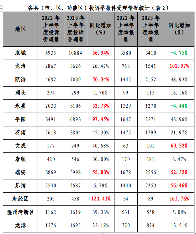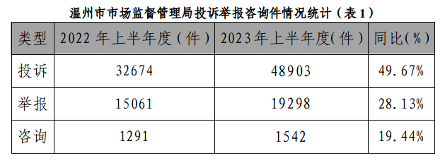 浙江省温州市市场监督管理局2023年上半年度投诉举报情况分析