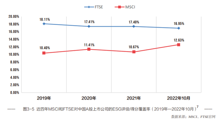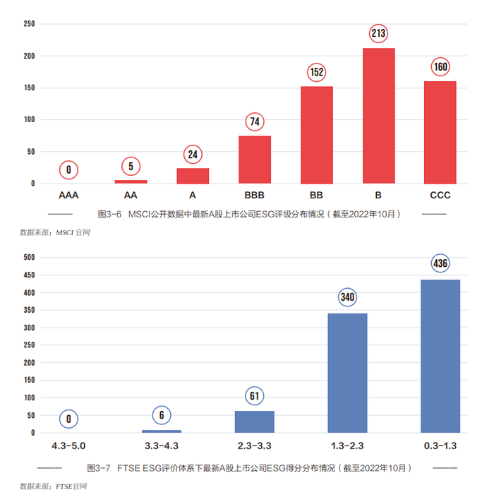 2019年至2022年10月,FTSE对中国A股上市公司的ESG评分数据覆盖率整体高于MSCI,基本维持在17%至18%;MSCI对中国A股上市公司的ESG评级数据覆盖率则是持续上升,已达12.63%。从具体公司数量上看,FTSE的ESG评级及数据模型已覆盖了843家中国A股上市公司,MSCI则是在公开数据中显示了628家A股上市公司的ESG评级结果。