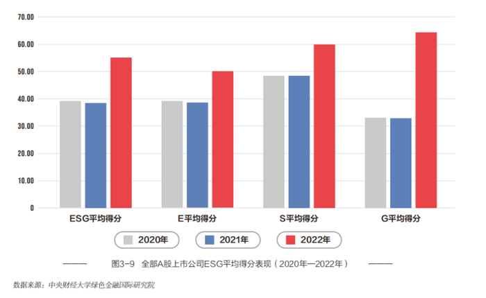 从E、S、G单项得分表现来看,2022年A股上市公司的表现呈现大幅提升。这个结果可以在一定程度上反映出当前已有越来越多的中国上市公司开始关注ESG理念,并着手开展相关实践。