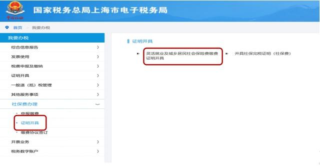登录后,在首页界面【我要办税】模块中选择【社保费办理】—【证明开具】—【灵活就业及城乡居民社会保险费缴费证明开具】