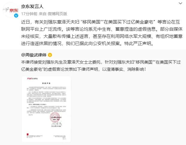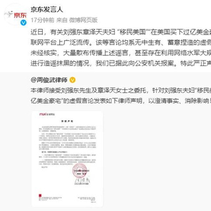 近日,有关刘强东章泽天夫妇 “移民美国”“在美国买下过亿美金豪宅〞等言论在互联网平台上广泛流传。该等言论均系无中生有、蓄意捏造的虚假信息。