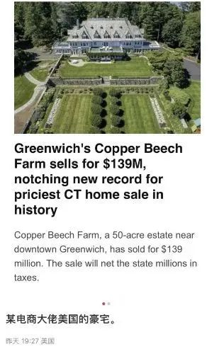 从外网公布的信息来看,该豪宅位于美国东岸康涅狄格州(下简称康州)的格林威治,于8月3日以1.39亿美元(约合人民币10亿元)的高价被卖出,是康州历史上成交价最贵的住宅。