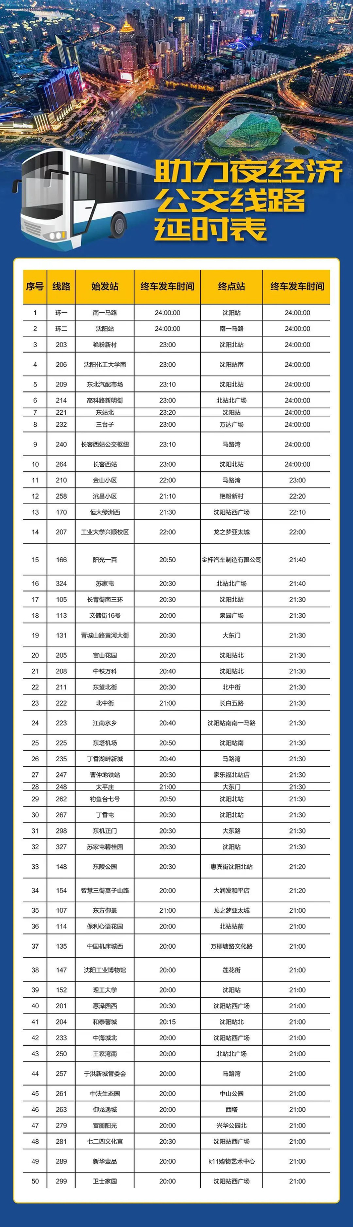 为进一步促进沈城夜经济发展,服务市民夜间出行,沈阳市交通运输局以中街、太原街、北市场、西塔、北行、铁百、奥体中心等城市主要商圈及外地来沈游客目的地、市民休闲娱乐相对集中区为重心,8月15日至10月15日有针对性地对途经崇山路、昆山路、市府大路、中山路、十一纬路、十三纬路、文化路、浑南大道、兴华街、兴工街、胜利大街、南京街、和平大街、青年大街、奉天街、南北二干线、东一环等连接城市大型居民区与商圈及旅游、休闲娱乐区域的50条公交线路进行延时运营,形成了“八横九纵”公交夜间出行网络,覆盖了41处夜间生活活跃区域,有效满足了市民夜间出行需求。