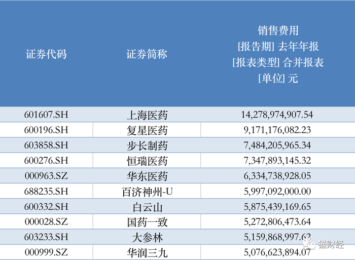 而整个A股现有医药行业上市公司“销售费用”等数据也成为各方关注的重点,蓝鲸财经记者统计了行业内485家上市公司的相关财报数据,去年整个行业合计支出销售费用达到3489亿元,其中前2%的公司就合计贡献了全行业20%的销售费用支出。