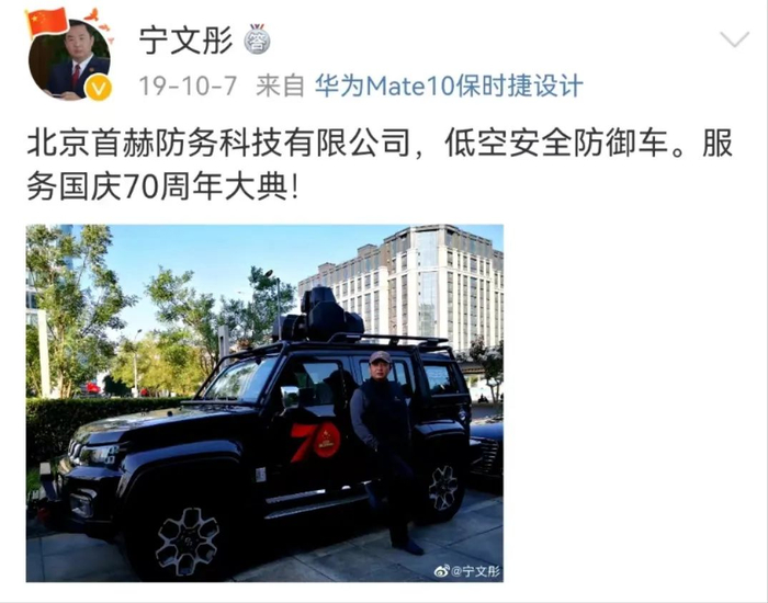 2019年10月,他公司的低空安全防御车,亮相70周年国庆大典。