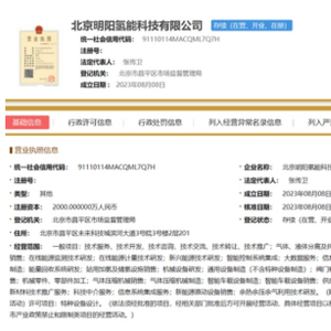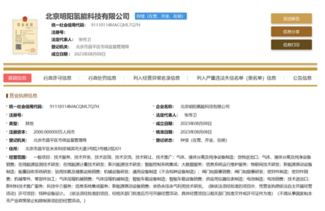 近日,国家企业信用信息公示系统显示,北京明阳氢能科技有限公司于2023年8月8日在北京正式成立。企查查APP显示,明阳氢能是一家中外合资公司,注册资本2000万元,经营范围包括新能源原动设备制造、能量回收系统研发、站用加氢及储氢设施销售、智能车载设备制造、电池制造、电池销售等。