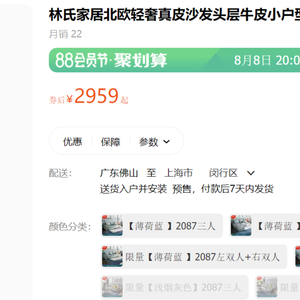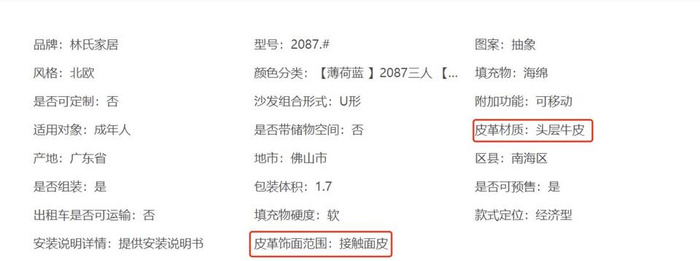 于是,她又到商家旗舰店中找到该款产品的链接进行确认,发现商家宣传页面中确实明确标注有“林氏家居北欧轻奢真皮沙发头层牛皮”的字样。在宝贝详情页面中也明确该产品皮革材质为头层牛皮;皮革饰面范围:接触面皮。在真皮页面展示中则标注靠背、坐垫两部分和人体的接触面是头层牛皮,其他部分是仿皮。