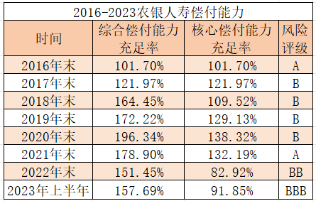 与一季度相比,农银人寿二季度综合偿付能力充足率157.69%,环比下滑3.32个百分点,核心偿付能力充足率91.85%,环比下滑2.93个百分点,风险综合评级为BBB。