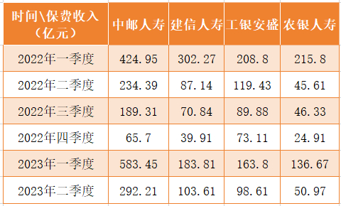 从保费分布规律来看,银行系险企大多在第一季度即开门红期间保费收入最高,之后逐季下降,分化严重。以农银人寿为例,公司去年四个季度保险收入分别为215.8亿元、45.61亿元、46.33亿元、24.91亿元;今年一、二季度保险业务收入分别为136.67亿元、50.97亿元。