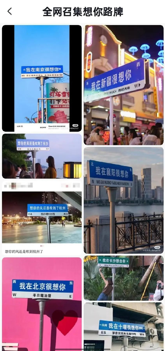 随后,这些路牌便像病毒一般传遍社交网络。截至目前,“全网召集想你路牌”的话题在社交平台小红书上的浏览量高达499.4万次,在短视频平台抖音上的播放次数超过6.7亿次。