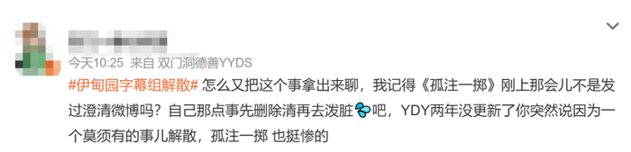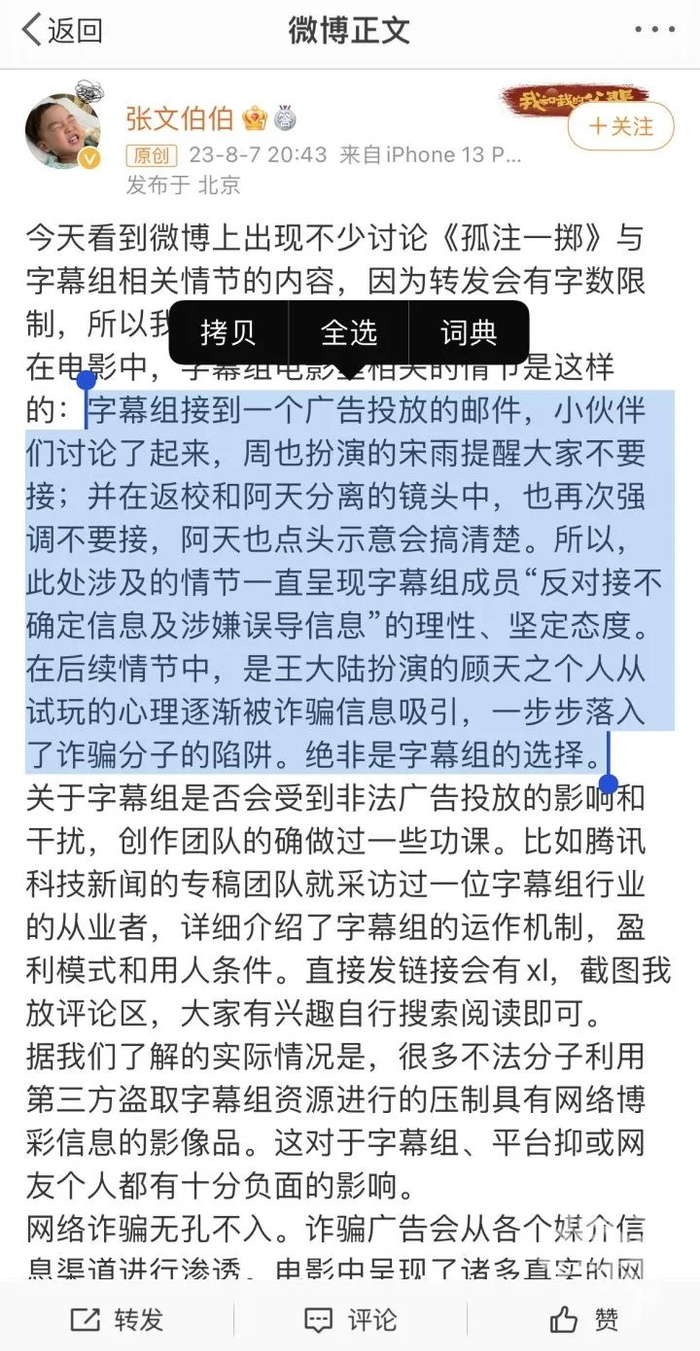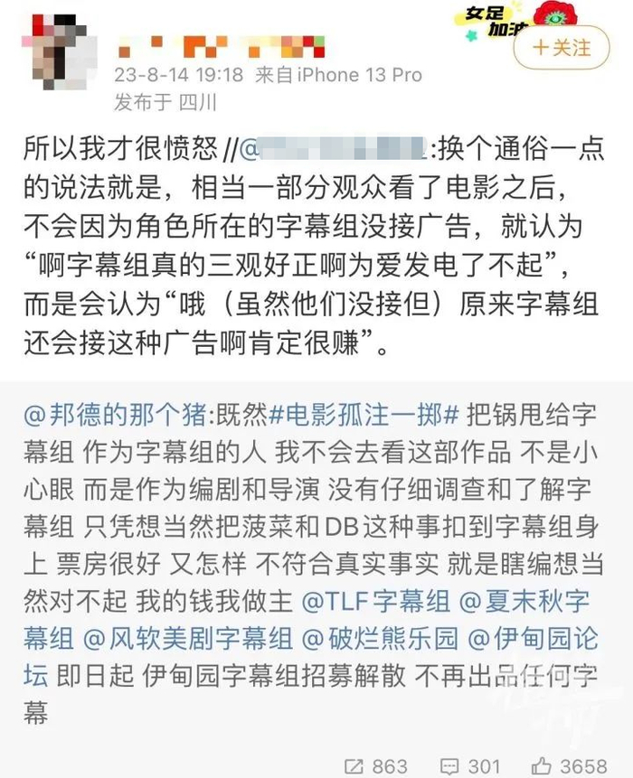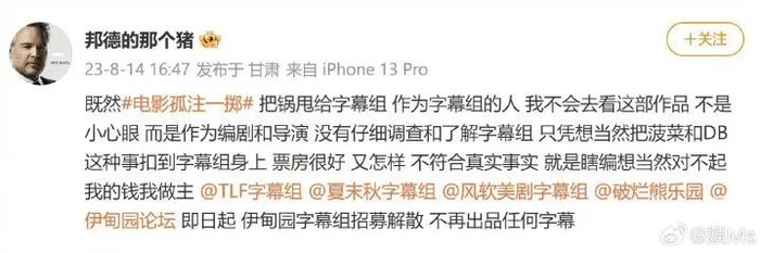伊甸园字幕组的老大“邦德的那个猪”,8月14下午在其个人微博上宣布,即日起伊甸园字幕组招募解散,不再出品任何字幕,并把矛头指向电影《孤注一掷》,“作为编剧和导演,没有仔细调查和了解字幕组,只凭想当然把菠菜(指博彩)和DB(指赌博)这种事扣到字幕组身上,票房很好,又怎样?不符合真实事实,就是瞎编想当然对不起。”