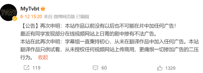 此前,TVBT日菁字幕组的官方微博也发布公告申明:“本站作品以前没有,以后也没可能在片中加任何广告”。