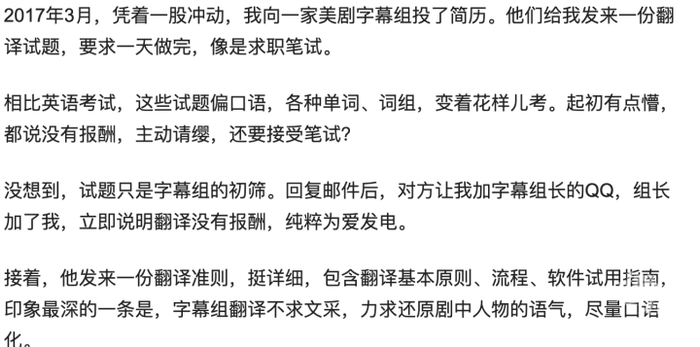 曾参与《心灵猎人》《威尔和格蕾丝》等多部美剧字幕制作的于润泽在《我所经历的字幕组消亡》中曾回忆说:“回复邮件后,对方让我加字幕组长的QQ,组长加了我,立即说明翻译没有报酬,纯粹为爱发电。”“很久以后我才知道,字幕组除了我这样的学生,半数都有工作,这些翻译都是他们在工作时间偷偷完成的。大家分工明确,每周一午前,有人搞到资源和原字幕,有人拆分字幕,有人整理志愿翻译的名单,分发任务。”
