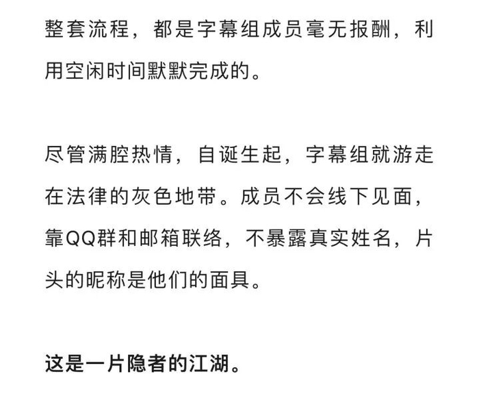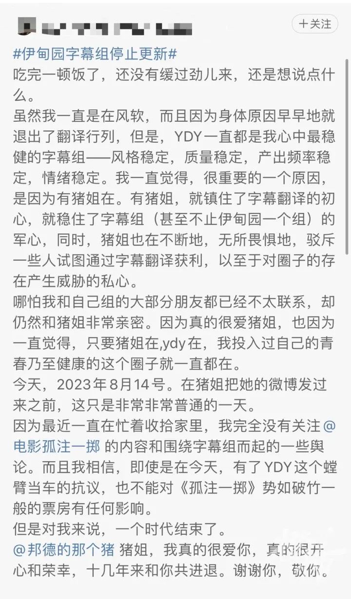“邦德的那个猪”也发表了落幕感言,“停止更新,不等于我不关心,我会一直陪着我的翻译和友邻组的翻译们,只是不再制作参与新的字幕相关,就让那十几万分钟的时间轴留在时间洪流里,或者有人会回头看一眼想起年少时那些熬夜追剧时光,有我们的无声陪伴,也许我会参与一些公益项目,但是欧美剧和电影,我们已经创造过历史,很庆幸,你们的成长里有过我。”