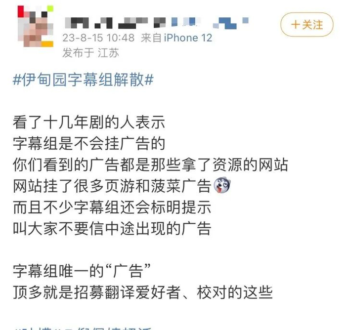 字幕组的兴起也可以说是时代的产物。在国内视频网站还没兴起的年代,字幕组曾是很多人接触国外剧集的重要渠道。而后随着,国人版权意识的加强以及各大视频网站的崛起,游走在法律边缘中的字幕组也日渐式微,但伊甸园解散消息的一出,还是立马让不少网友为之唏嘘。一位有过字幕组经历的网友不禁感叹说:“一个时代结束了”。