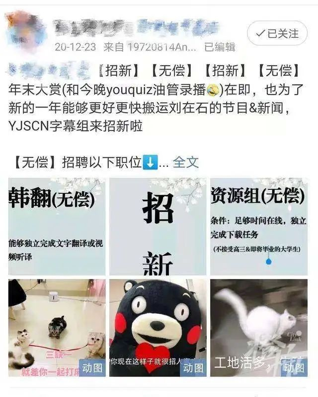 字幕组在招募时也往往会在显著位置标注“无金钱报酬”。