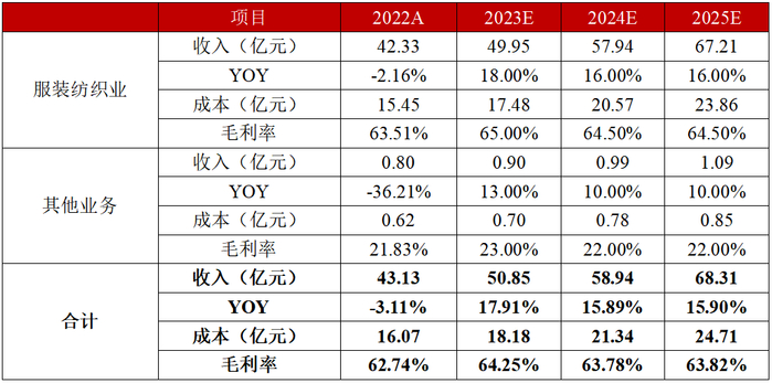 4.结合往年数据,将服装纺织业、其他业务的2023年毛利率预测设为65%、23%;参考往年数据进行预测,将2024及2025年上述行业的收入增长设定为64.5%、22%。