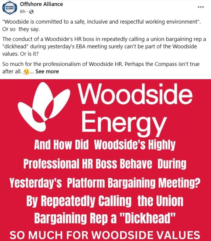 离岸联盟在帖子中还透露,“伍德赛德的一位人力资源主管多次称工会谈判代表为‘白痴’,这种行为肯定不是伍德赛德价值观的一部分,是嘛?”