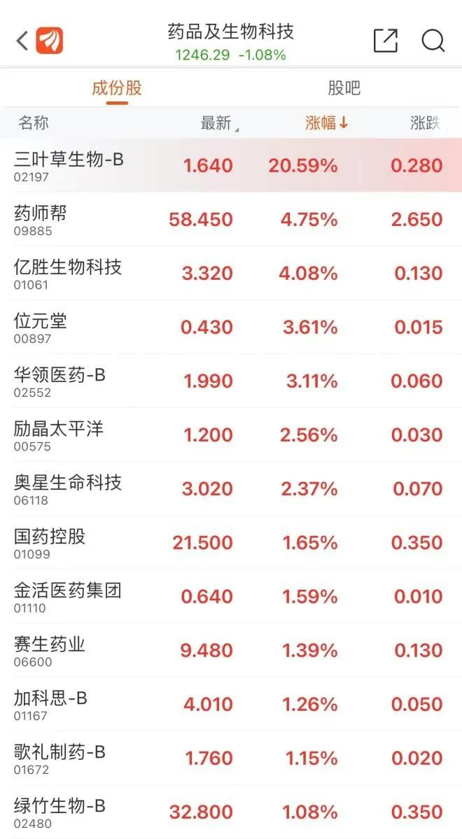 今日早盘,前期持续下行的医药股迎来回暖。截至发稿,三叶草生物-B涨超20%,药师帮涨近5%,华领医药-B、国药控股、歌礼制药-B等跟涨。8月11日至8月16日,三叶草生物-B累计涨幅超过70%。