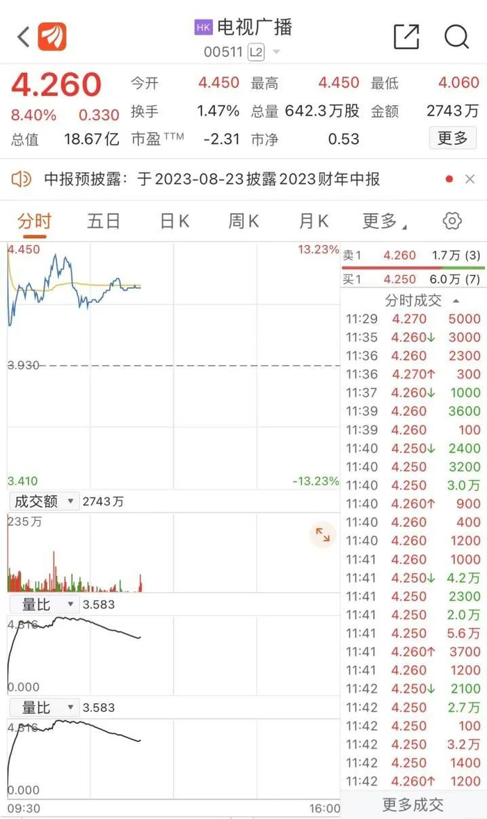 今日早盘,TVB母公司电视广播高开13.23%。截至发稿,涨8.4%,报4.26港元/股,市值18.67亿港元。