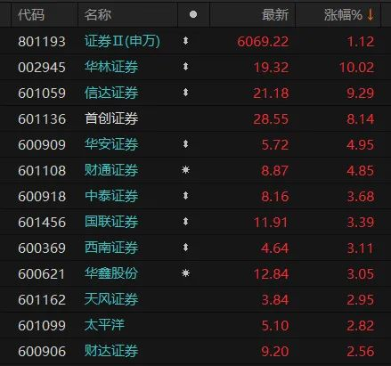 券商板块早盘再次逆势走强。截至午间休市,申万证券行业指数上涨1.12%,华林证券涨停,近期收获两连板,信达证券涨超9%,首创证券涨超8%,财通证券、华安证券等纷纷跟涨。