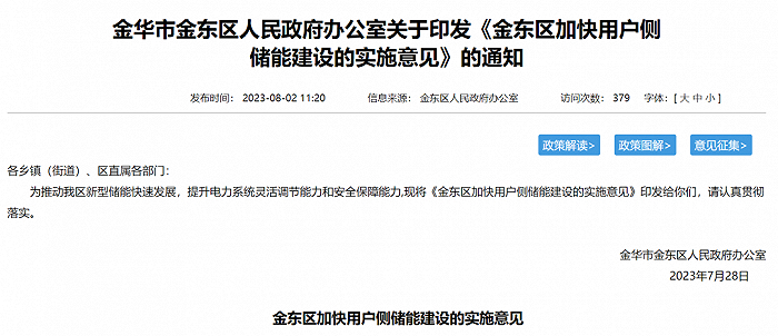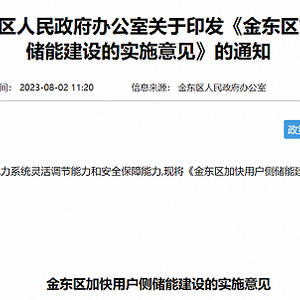 2023年8月2日,浙江金华金东区人民政府发布《金东区加快用户侧储能建设的实施意见》,要求新建设的非居民分布式光伏发电项目原则上按照装机容量的10%以上配建储能系统,额定功率下连续放电时间不低于2小时。至2024年,金东区建成并网10MW/20MWh用户侧储能项目,十四五实现30MW/60MWh的发展目标。意见还指出,鼓励企业用户利用分时电价机制,主动削峰填谷,优化电网负荷需求。
