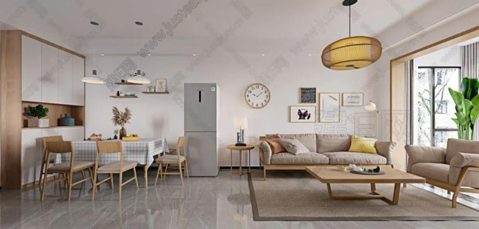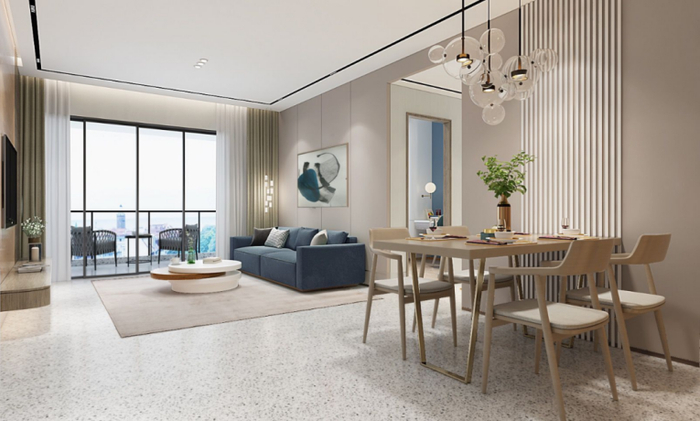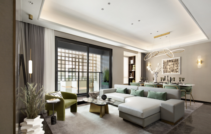 建面约88㎡拥有一个6.5m长进深的大客厅。室内的光照立刻上升了一个层次,让居者整体视野更加开阔。同时把客厅餐厅与室外的衔接也自然融入其中,极大地提高了空间的开阔感,让居者更加舒适自在。