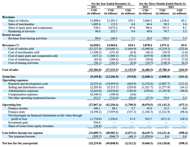 VinFast在6月份递交的文件显示,2021年、2022年和2023年1-3月,其净亏损分别约为13.43亿美元、21.12亿美元、5.99亿美元,两年多来累计亏损超40亿美元。但与此同时,VinFast的营收却在今年第一季度下滑了近50%。