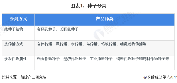 种子是裸子植物和被子植物特有的繁殖体,粮食、棉花等均来源于种子的繁殖。在现代农业中,种子位于产业链的顶端,是农业的核心资料,因此种子也被称为农业的“芯片”。按照种子结构、传播方式和农作物属性三种方式,可将种子分成不同类产品。