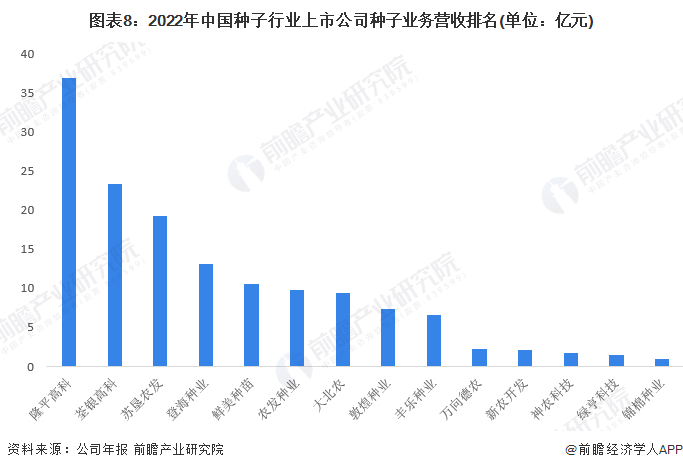 2022年,在中国种子行业上市公司中,隆平高科、荃银高科、苏垦农发等种子业务营收规模领先。隆平高科种业收入超过35亿元,位列行业第一。荃银高科种业营收超过20亿元,苏垦农发超过15亿元,分别位列第二和第三。
